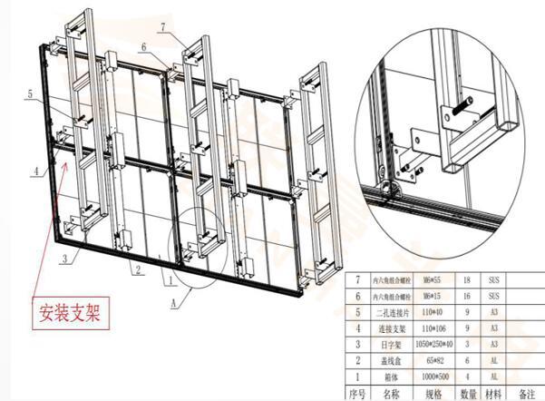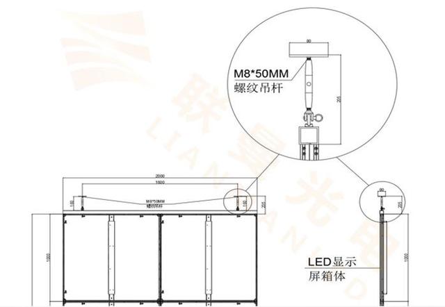 屏體通過(guò)吊鉤與吊梁安裝透明屏箱體之間通過(guò)快鎖或連接片連接,常應(yīng)用于舞臺(tái)櫥窗店鋪等。