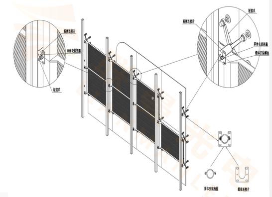 箱體通過(guò)組合抱箍件固定在玻璃幕墻龍骨上常應(yīng)用于建筑玻璃幕墻。